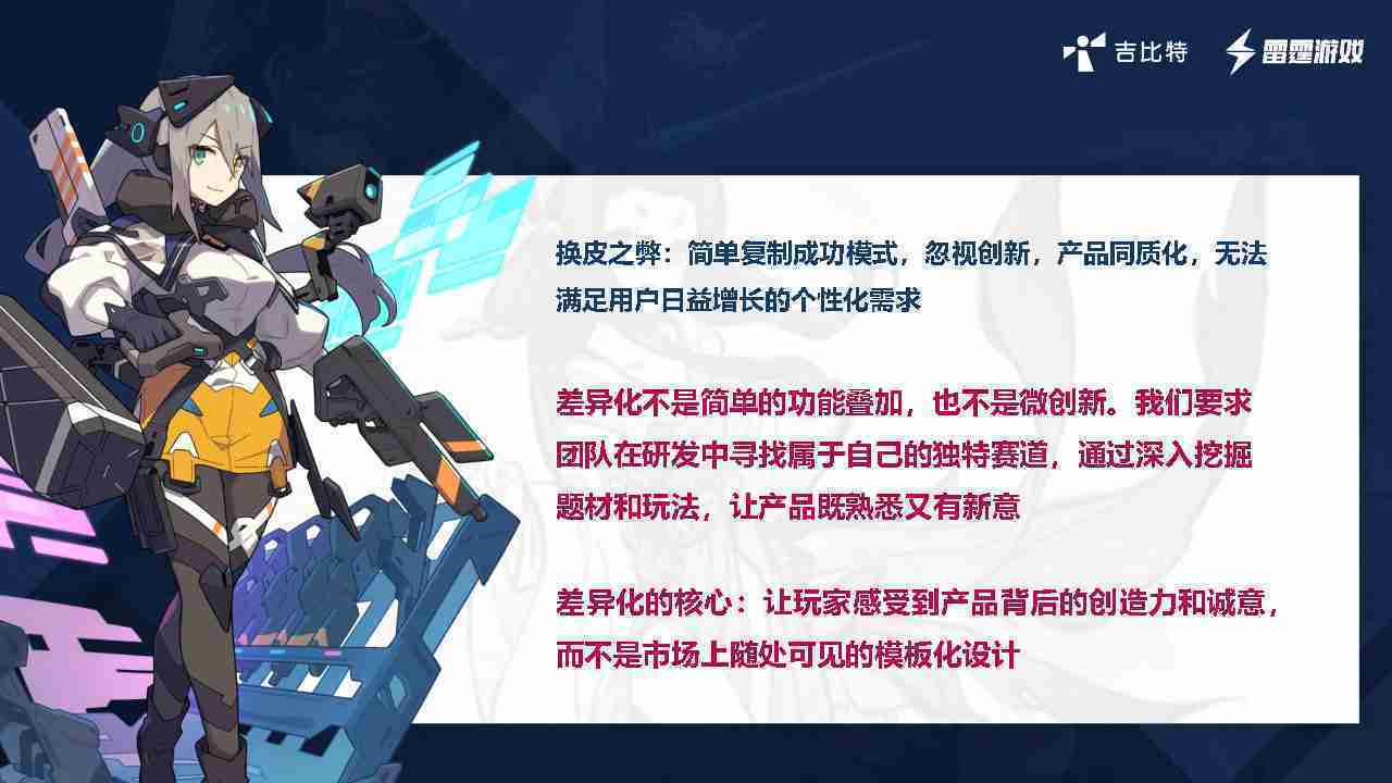 在我们内部是这么定义差异化的。。。。首先,,,差异化不是简单的功能叠加,,,,更不是换皮。。。只是换皮,,,,产品无法提供有效的市场价值。。。内部经常说差异化的产品不是为了迎合市场,,而是找到一个自己独特的表达方式,,,在研发中找到属于自己的细分赛道和独特赛道,,,前提是需要对这个题材有足够的深入、、、挖掘,,,对玩法有足够深入的理解,,,,让产品看起来既熟悉又有新意。。。。