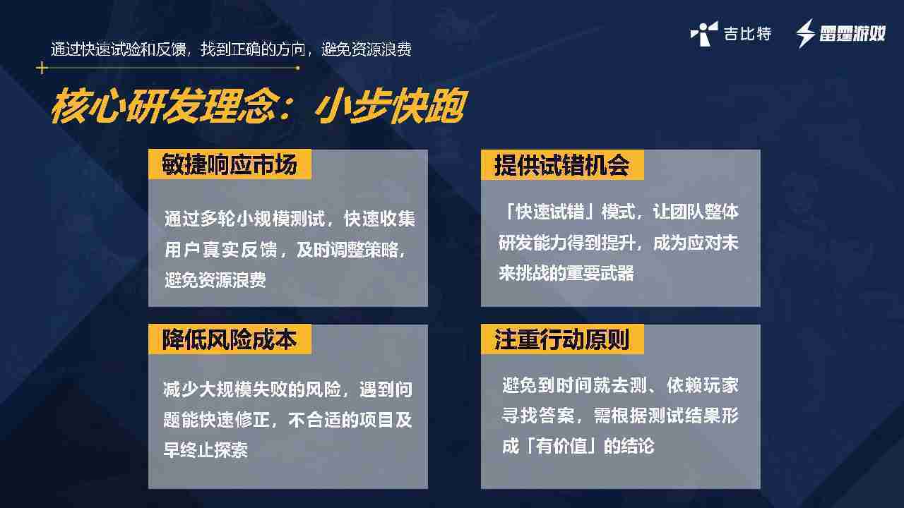 小步快跑不是找答案,,而是验证答案。。。我们之前有项目是这样的,,,,有些制作人会有几个方向觉得都可以做,,,但是不确定做哪一个,,会选择几个都做,,,,做完拿到市场跑,,,跑出哪一个更好,,,基于这个再做后续的研发和拓展。。但这种情况最容易出现一个问题,,,,可能被玩家裹胁,,玩家说这个点不错、、、那个点不错,,,,到底听还是不听,,,,不听感觉是无视玩家的反馈,,,听的话,,可能自己没想清楚导致研发思路发生偏颇。。。所以针对这一点后面自己复盘整理,,发现制作人自己心里要有数,,,,要做自己觉得好玩的,,,而且明确知道这个东西是你想做的,,,,然后拿到市场验证这个答案是不是对的,,而不是拿一堆答案找哪一个答案更好。。。。